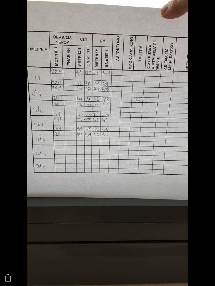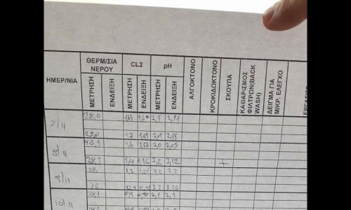 · Μέτρηση και καταγραφή σε ειδικό βιβλίο αποτελεσμάτων της θερμοκρασίας νερού, του ph, του Cl2, δύο φορές ημερησίως.