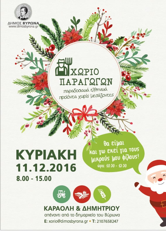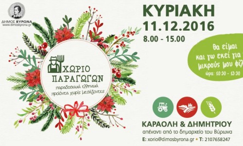 Την Κυριακή 11 Δεκεμβρίου 2016, στο πάρκο της Καραολή & Δημητρίου απέναντι από το Δημαρχείο, θα διεξαχθεί η κοινωνική δράση “Χωριό Παραγωγών”, που διοργανώνεται από τον Δήμο Βύρωνα με ώρες λειτουργίας 08:00 – 15:00.
