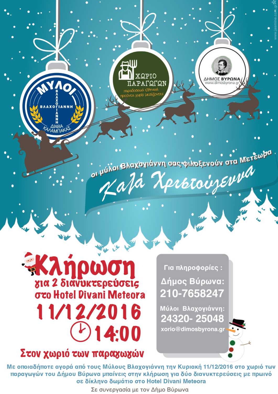 Με οποιαδήποτε αγορά από τους Μύλους Βλαχογιάννη, αυτήν την Κυριακή, μπαίνετε στην κλήρωση για δύο διανυκτερεύσεις με πρωϊνό σε δίκλινο δωμάτιο στον Hotel Divani Meteora. (Η κλήρωση θα πραγματοποιηθεί στις 14.00) τηλ. Μύλοι Βλαχογιάννη 24320 25048
