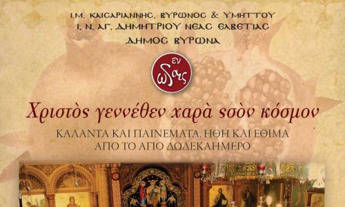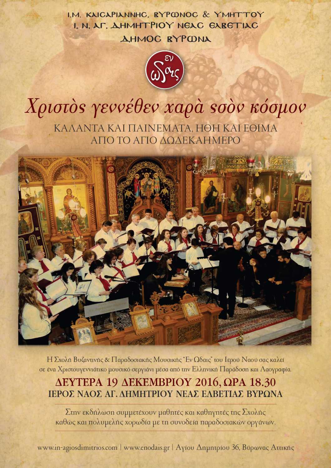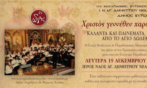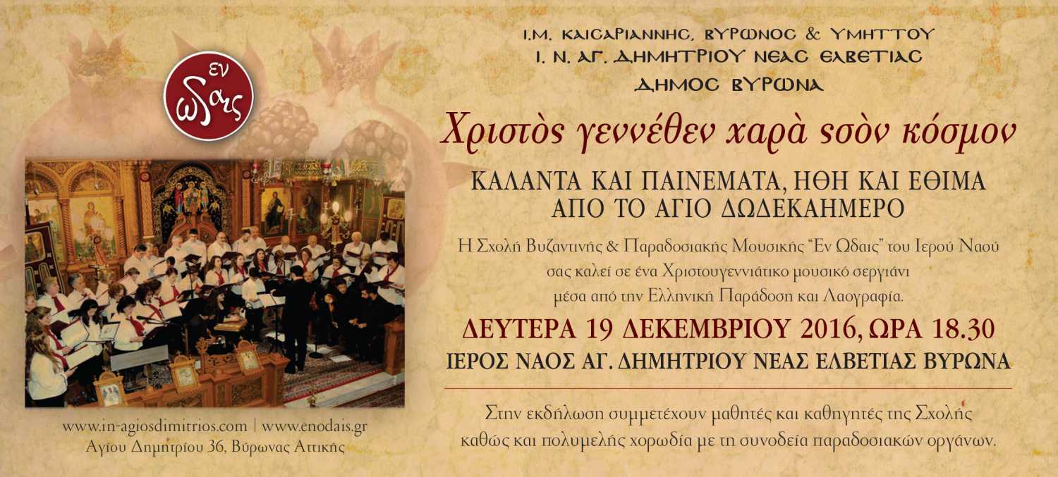 Η Σχολή Βυζαντινής & Παραδοσιακής Μουσικής «Εν Ωδαίς» του Ι.Ν. Αγίου Δημητρίου Νέας Ελβετίας και ο Δήμος Βύρωνα σας καλούν σε ένα χριστουγεννιάτικο μουσικό σεργιάνι μέσα από την Ελληνική Παράδοση και Λαογραφία με τίτλο «Χριστὸς γεννέθεν χαρὰ ςσὸν κόσμον».