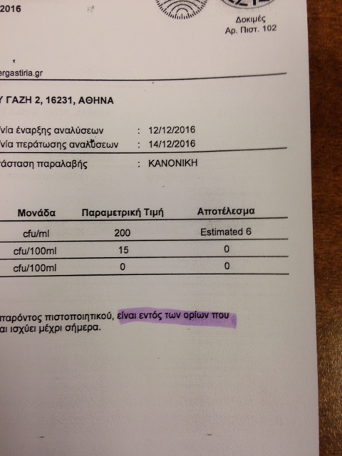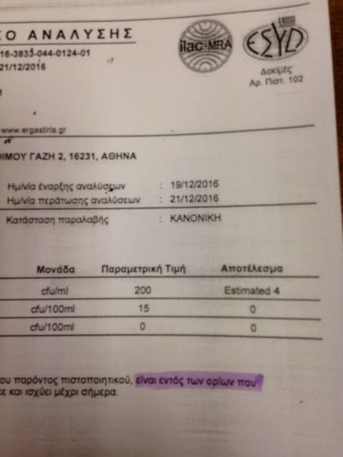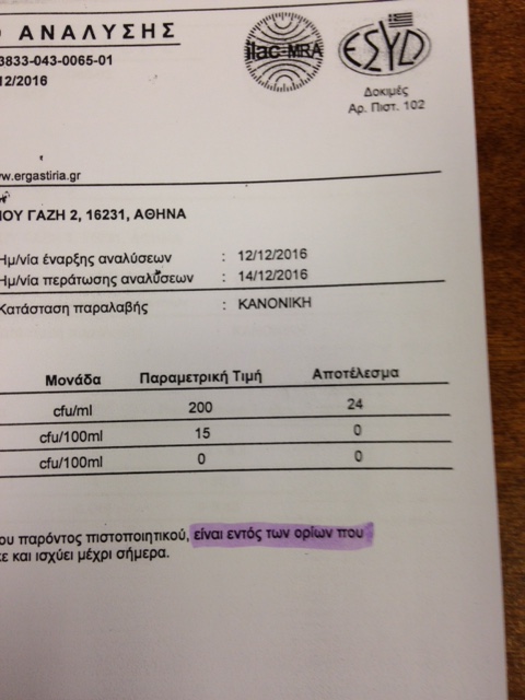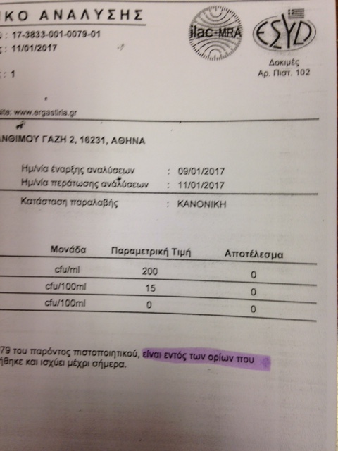 Αναφορικά με τον εργαστηριακό έλεγχο των δεξαμενών του κολυμβητηρίου, θέτουμε στη διάθεση των δημοτών ΟΛΟΥΣ τους ελέγχους του τελευταίουμήνα που φέρουν την ένδειξη «εντός των ορίων» που καθορίζονται στην Υγειονομική Διάταξη Γ1/443, ΦΕΚ 87/Β/1973, (σε ό,τι αφορά τα αποτελέσματα του ελέγχου για αερόβιους μικροοργανισμούς στους 37ο C, για κολοβακτηριοειδή και για Escherichia coli).