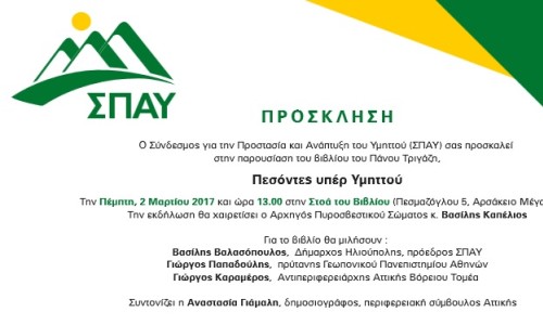 Ο Σύνδεσµος για την Προστασία και Ανάπτυξη του Υµηττού (ΣΠΑΥ) σας προσκαλεί στην παρουσίαση του βιβλίου του Πάνου Τριγάζη, «Πεσόντες υπέρ Υµηττού».