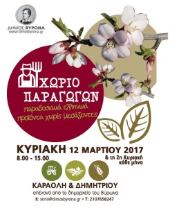 Την Κυριακή 12 Μαρτίου 2017, στο πάρκο της Καραολή & Δημητρίου απέναντι από το Δημαρχείο, θα διεξαχθεί η κοινωνική δράση “Χωριό Παραγωγών”, που διοργανώνεται από τον Δήμο Βύρωνα με ώρες λειτουργίας 08:00 – 15:00.