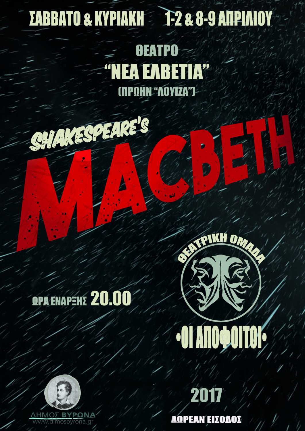 O Δήμος Βύρωνα στο πλαίσιο των Πολιτιστικών Εκδηλώσεων θα φιλοξενήσει τη θεατρική ομάδα «ΟΙ ΑΠΟΦΟΙΤΟΙ», σε μία παρουσίαση του έργου του Ουίλλιαμ Σαίξπηρ «Μάκμπεθ».