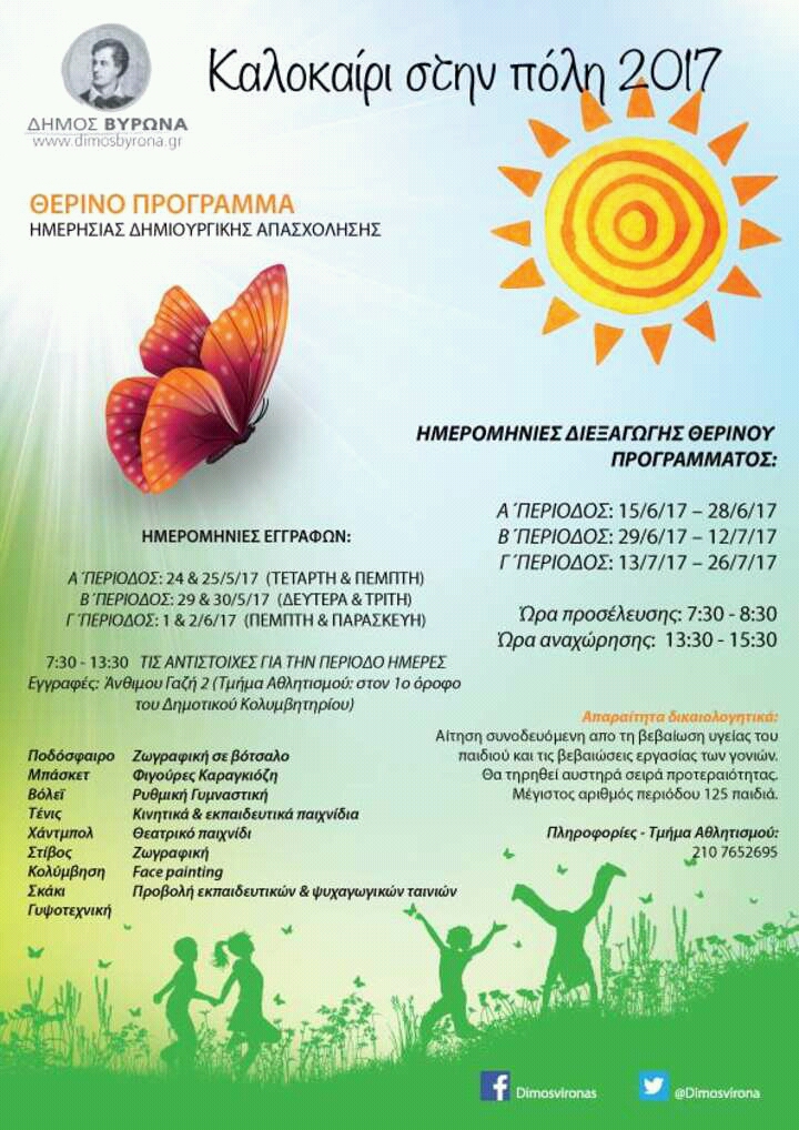 Για το Θερινό Πρόγραμμα Δημιουργικής Απασχόλησης ο Δήμαρχος Βύρωνα Γρηγόρης Κατωπόδης δήλωσε: «Σας προσκαλούμε με ιδιαίτερη χαρά στο Θερινό Πρόγραμμα Ημερήσιας Δημιουργικής Απασχόλησης «Καλοκαίρι στην Πόλη 2017» που διοργανώνει κάθε χρόνο με επιτυχία ο Δήμος μας. Πρόκειται για μία κοινωνική δράση που στηρίζει όλη την οικογένεια καθώς δίνει λύση σε ένα πρόβλημα που αντιμετωπίζουν οι γονείς μετά το κλείσιμο των σχολείων. Επιμεληθήκαμε και διαρθρώσαμε το θερινό πρόγραμμα ημερήσιας δημιουργικής απασχόλησης με βάση τις σύγχρονες υψηλές απαιτήσεις δημιουργικής και παιδαγωγικής απασχόλησης. Τα παιδιά απασχολούνται δημιουργικά και ευχάριστα σε ένα ιδανικό και ασφαλές περιβάλλον από άριστα καταρτισμένους εκπαιδευτές και παιδαγωγούς και αναπτύσσουν πνεύμα συνεργασίας μέσα από τη συμμετοχή τους σε ομαδικές δραστηριότητες. Σας εύχομαι ένα ευχάριστο και δημιουργικό καλοκαίρι».