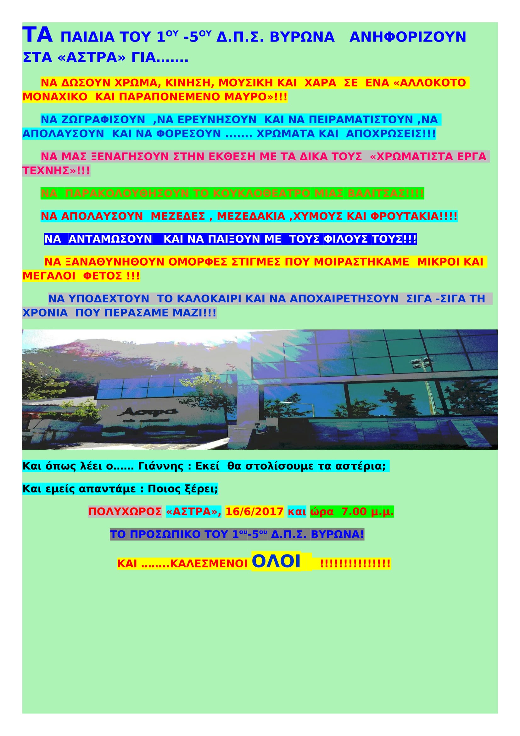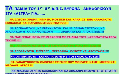 Τα παιδιά του 1ου – 5ου Δ.Π.Σ. Βύρωνα ανηφορίζουν στα «άστρα» για… να δώσουν χρώμα, κίνηση, μουσική και χαρά σε ένα «αλλόκοτο μοναχικό και παραπονεμένο μαύρο»!!!