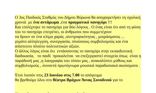 Ο 3ος Παιδικός Σταθμός του Δήμου Βύρωνα θα αποχαιρετήσει τη σχολική χρονιά με ένα αντάμωμα, ένα πραγματικό πανηγύρι!!!