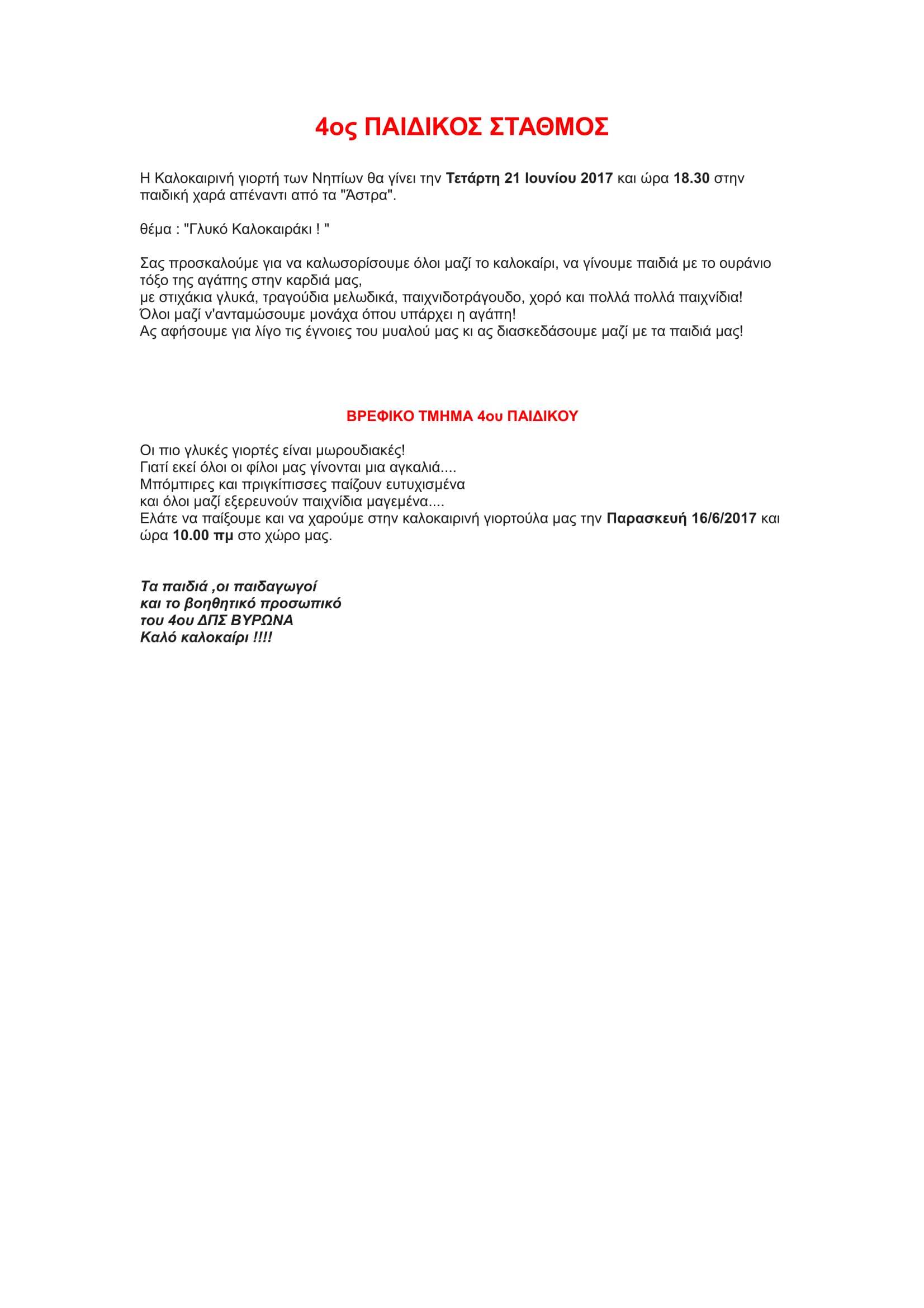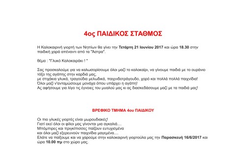 Η Καλοκαιρινή γιορτή των Νηπίων θα γίνει την Τετάρτη 21 Ιουνίου 2017 και ώρα 18.30 στην παιδική χαρά απέναντι από τα "¶στρα".