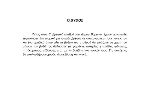 Φέτος στον 6ο βρεφικό σταθμό του Δήμου Βύρωνα, έχουν οργανωθεί εργαστήρια, ένα ατομικό για το κάθε βρέφος σε συνεργασία με τους γονείς του και ένα ομαδικό όπου όλα τα βρέφη του σταθμού θα φτιάξουν σε χαρτί του μέτρου τον βυθό της θάλασσας με ψαράκια, αστερίες, χταπόδια, φάλαινες, ιππόκαμπους, μέδουσες, κ.α. με τη βοήθεια των γονιών τους. Στη συνέχεια, θα ακολουθήσουν χορός, διασκέδαση και γλυκά.