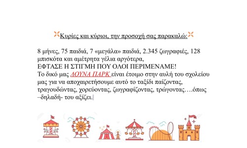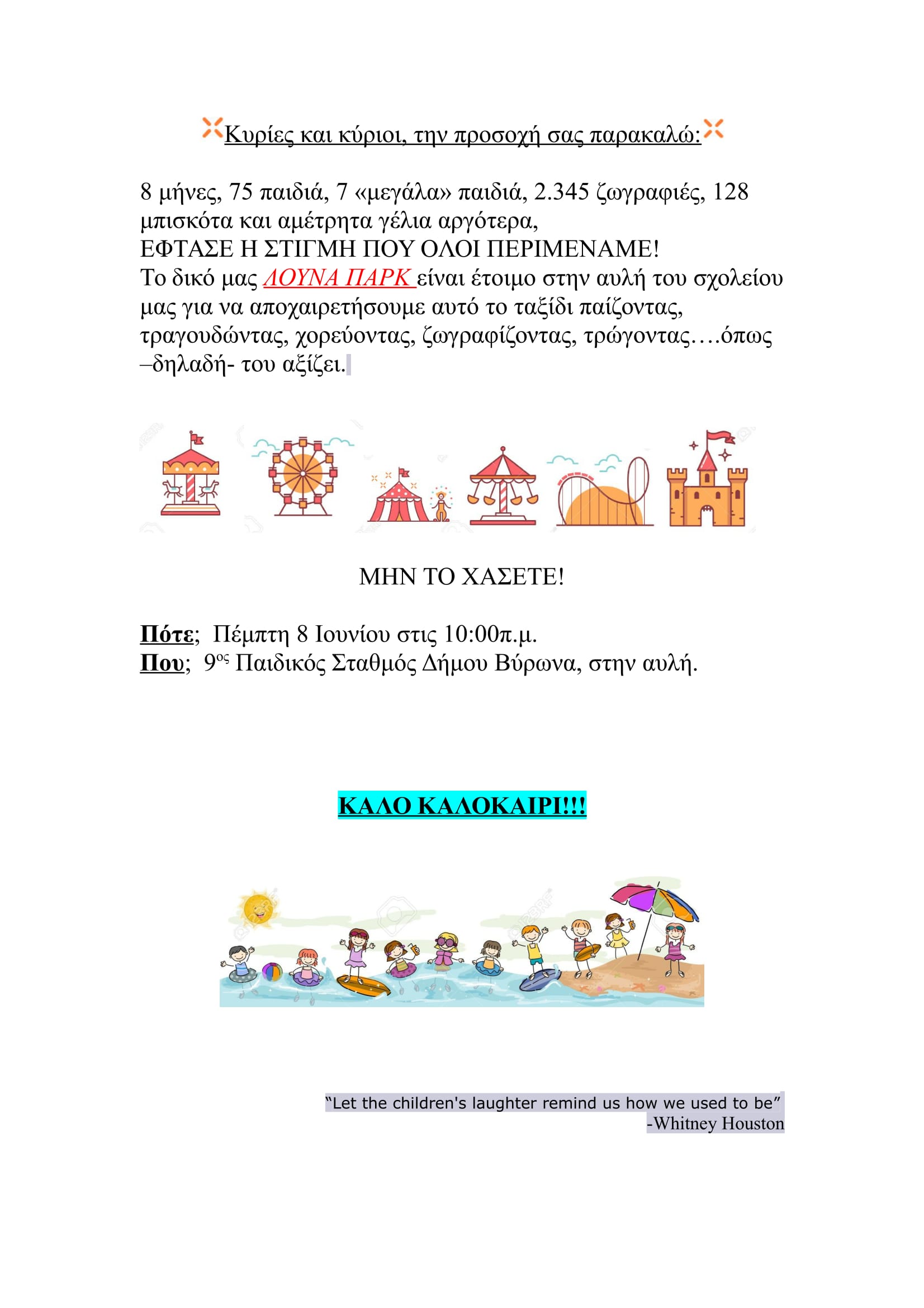 Το δικό μας ΛΟΥΝΑ ΠΑΡΚ είναι έτοιμο στην αυλή του σχολείου μας για να αποχαιρετήσουμε αυτό το ταξίδι παίζοντας, τραγουδώντας, χορεύοντας, ζωγραφίζοντας, τρώγοντας….όπως –δηλαδή- του αξίζει.