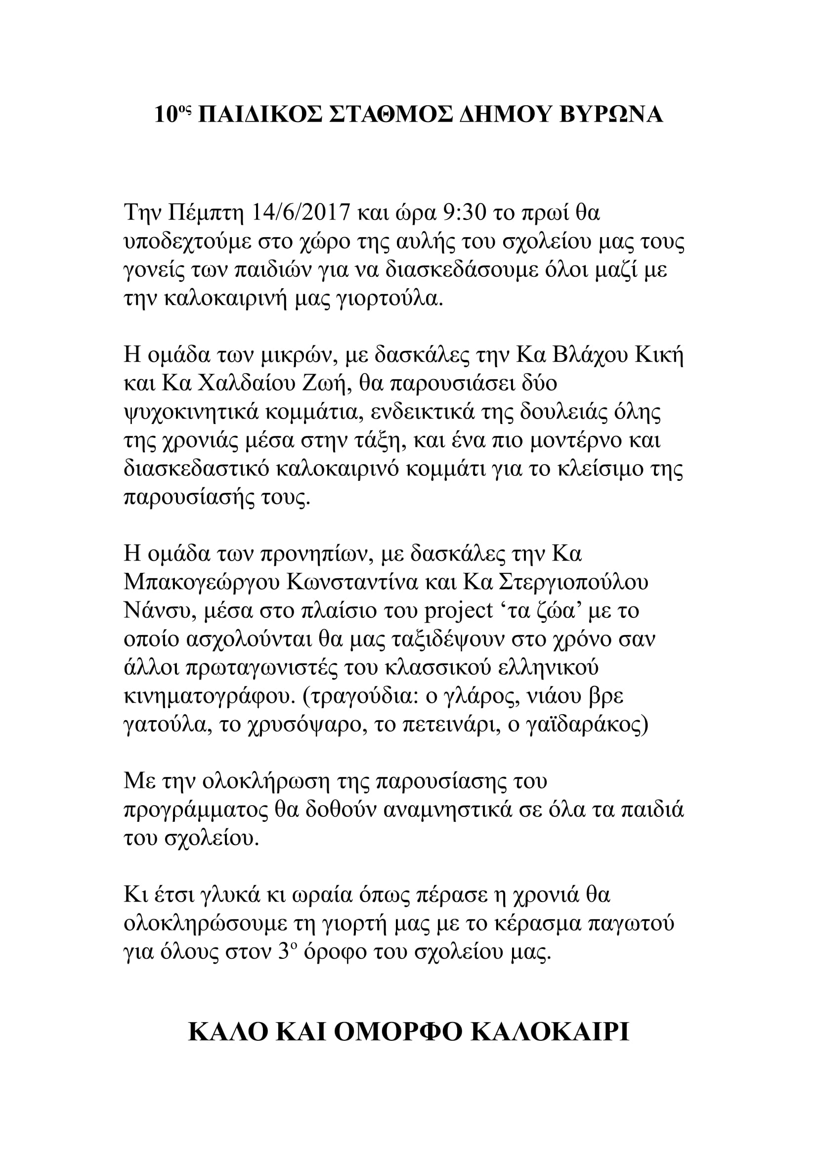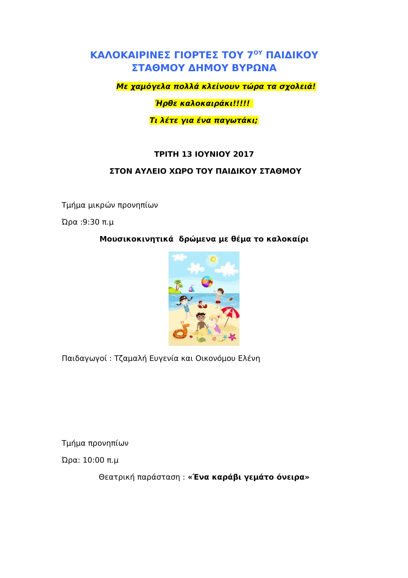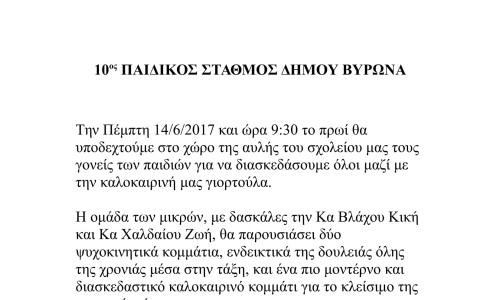 Ελάτε να παίξουμε και να χαρούμε στην καλοκαιρινή γιορτούλα μας την Παρασκευή 16/6/2017 και ώρα 10.00 π.μ. στο χώρο μας.