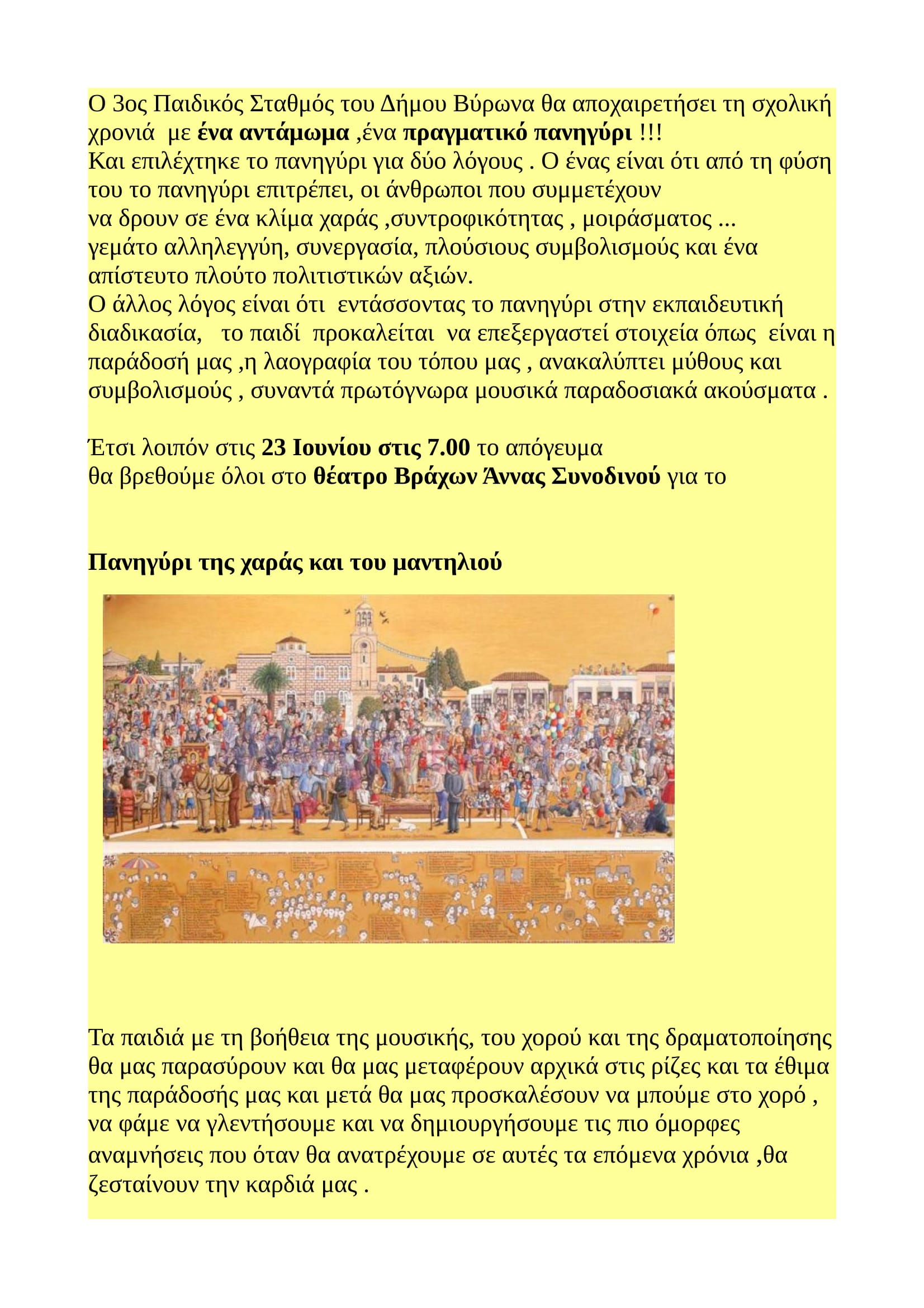 Έτσι λοιπόν στις 23 Ιουνίου στις 7.00 το απόγευμα θα βρεθούμε όλοι στο θέατρο Βράχων «¶ννα Συνοδινού» για το Πανηγύρι της χαράς και του μαντηλιού.