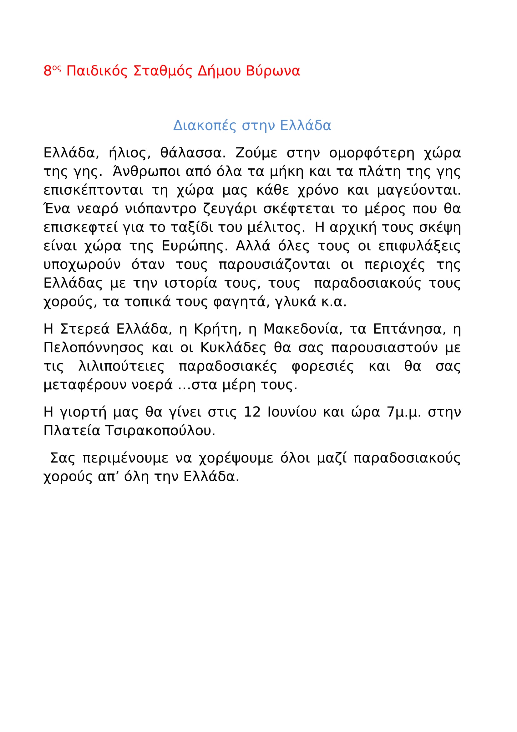 Η γιορτή μας θα γίνει στις 12 Ιουνίου και ώρα 7μ.μ. στην Πλατεία Τσιρακοπούλου.