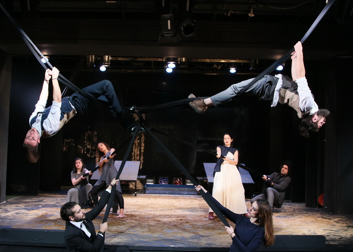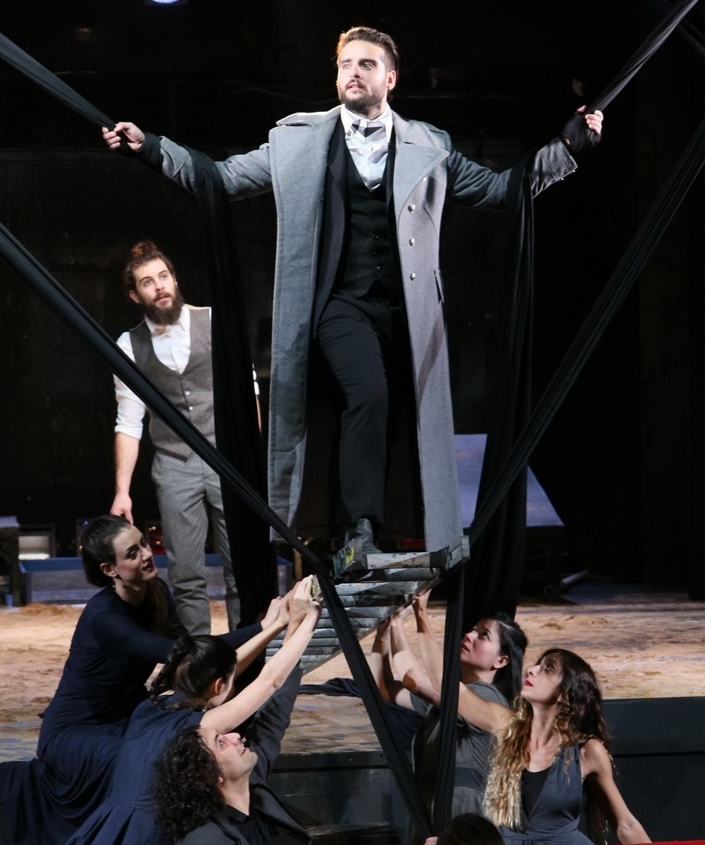 Ένα μεθυστικό πανηγύρι πάνω στην υπέροχη ιστορία του Οιδίποδα. Μια μυσταγωγία που αναζητά τις βαθιές, χοϊκές, αιμάτινες ρίζες. Τις δικές μας ρίζες. Οι ηθοποιοί για ένα μεγάλο μέρος της παράστασης αιωρούνται σε πανιά, καταβροχθίζουν άπληστα τον εναέριο χώρο του θεάτρου. Πίσω από αυτές τις εναέριες δράσεις κρύβεται μια απλή αρχή: ο τραγικός ήρωας δεν είναι τίποτα άλλο παρά μια μαριονέτα στα χέρια των θεών...