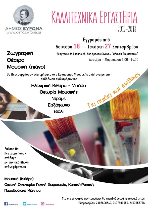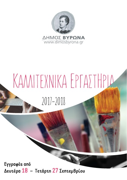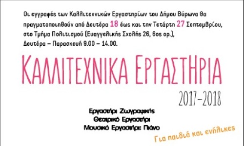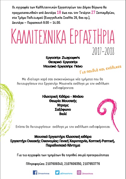 "Καλλιτεχνικά Εργαστήρια 2017-2018" Εγγραφές Δευτέρα 18 - Τετάρτη 27 Σεπτεμβρίου