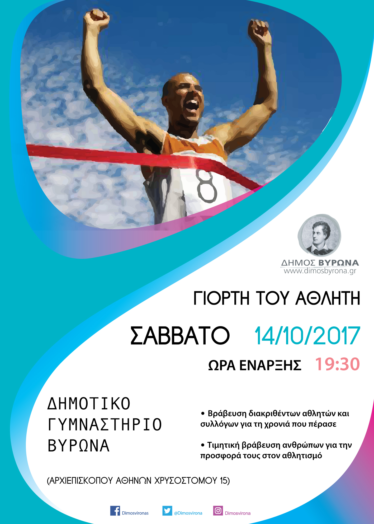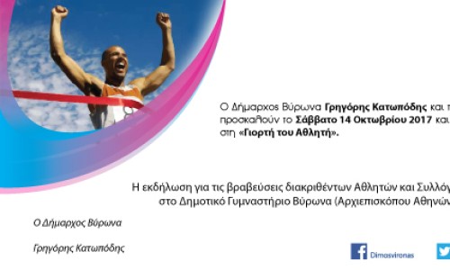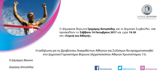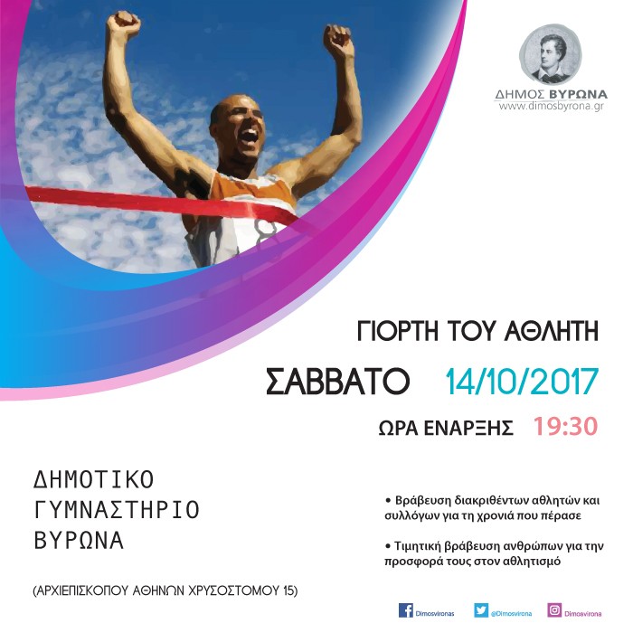 Ο Δήμος Βύρωνα, το Σάββατο 14 Οκτωβρίου 2017 και ώρα 19:30 στο Δημοτικό Γυμναστήριο Βύρωνα (Αρχιεπισκόπου Αθηνών Χρυσοστόμου 15) διοργανώνει τη «Γιορτή του Αθλητή».