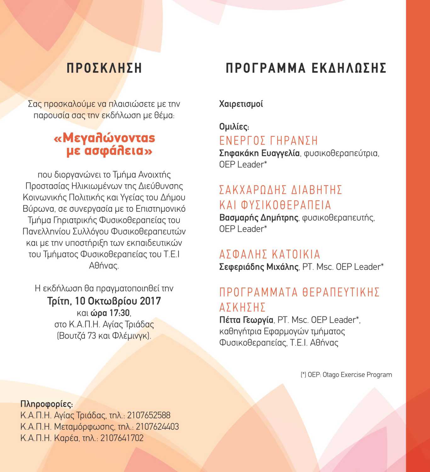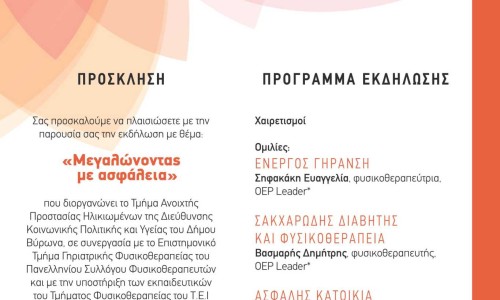 Στο πλαίσιο της Παγκόσμιας Ημέρας Ηλικιωμένων, το Τμήμα Ανοιχτής Προστασίας Ηλικιωμένων της Διεύθυνσης Κοινωνικής Πολιτικής και Υγείας του Δήμου μας, σε συνεργασία με το Επιστημονικό Τμήμα Γηριατρικής Φυσικοθεραπείας του Πανελληνίου Συλλόγου Φυσικοθεραπευτών και με την υποστήριξη των εκπαιδευτικών του Τμήματος Φυσικοθεραπείας του Τ.Ε.Ι. Αθήνας, διοργανώνει ενημερωτική εκδήλωση, με θέμα: