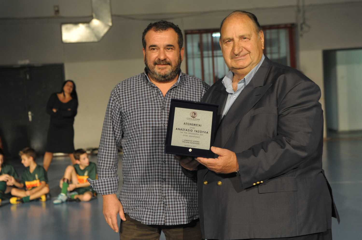 2. Αναστάσιος Τασούλας, με πολλές διακρίσεις στη σφαίρα, το δίσκο και την λιθοβολία, από τον Πρόεδρο του Δημοτικού Συμβουλίου Κώστα Αγγέλη.