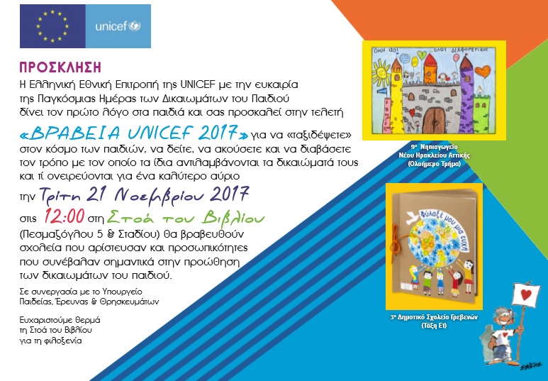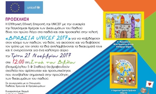 Η Ελληνική Εθνική Επιτροπή της UNICEF με την ευκαιρία της Παγκόσμιας Ημέρας των Δικαιωμάτων του Παιδιού δίνει τον πρώτο λόγο στα παιδιά στην τελετή «ΒΡΑΒΕΙΑ UNICEF» για να ταξιδέψετε στον κόσμο των παιδιών .