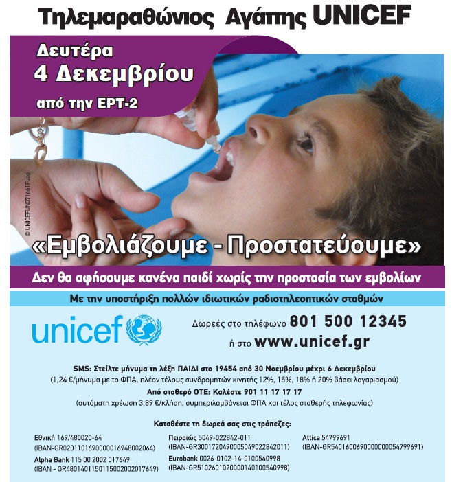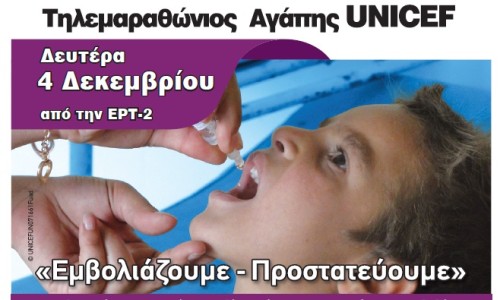 Με βασικό στόχο να μη μείνει κανένα παιδί στην Ελλάδα και στον κόσμο χωρίς την προστασία των εμβολίων, διοργανώνεται και φέτος ο μεγάλος Τηλεμαραθώνιος Αγάπης της Unicef.