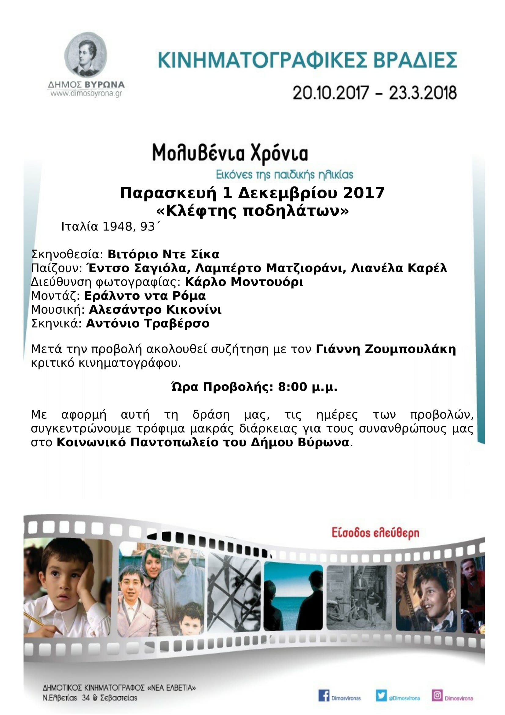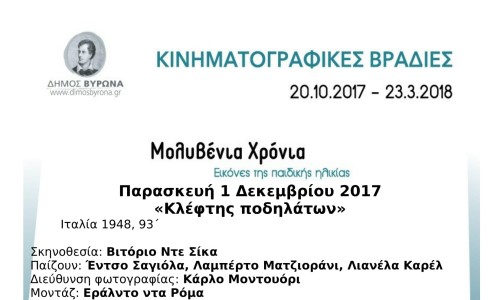4η Προβολή Κινηματογραφικών Βραδιών Δήμου Βύρωνα 2017-2018 «Κλέφτης Ποδηλάτων»