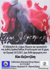 Η Athens Art και ο Δήμος Βύρωνα σας προσκαλούν στη Διεθνή Ομαδική Έκθεση 30 καλλιτεχνών από 20 χώρες την Κυριακή 10 Δεκεμβρίου 2017, ώρα: 20.00 αφιερωμένη στο Νίκο Καζαντζάκη.