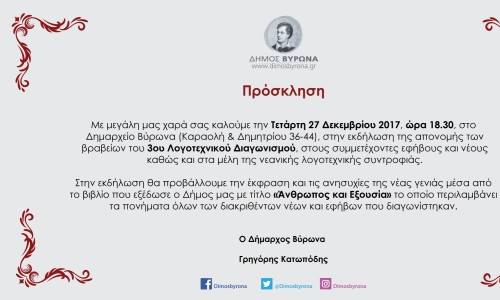 Η τελετή βράβευσης του 3ου Λογοτεχνικού Διαγωνισμού θα πραγματοποιηθεί την Τετάρτη 27 Δεκεμβρίου 2017, στις 18.30, στην αίθουσα του Δημοτικού Συμβουλίου.