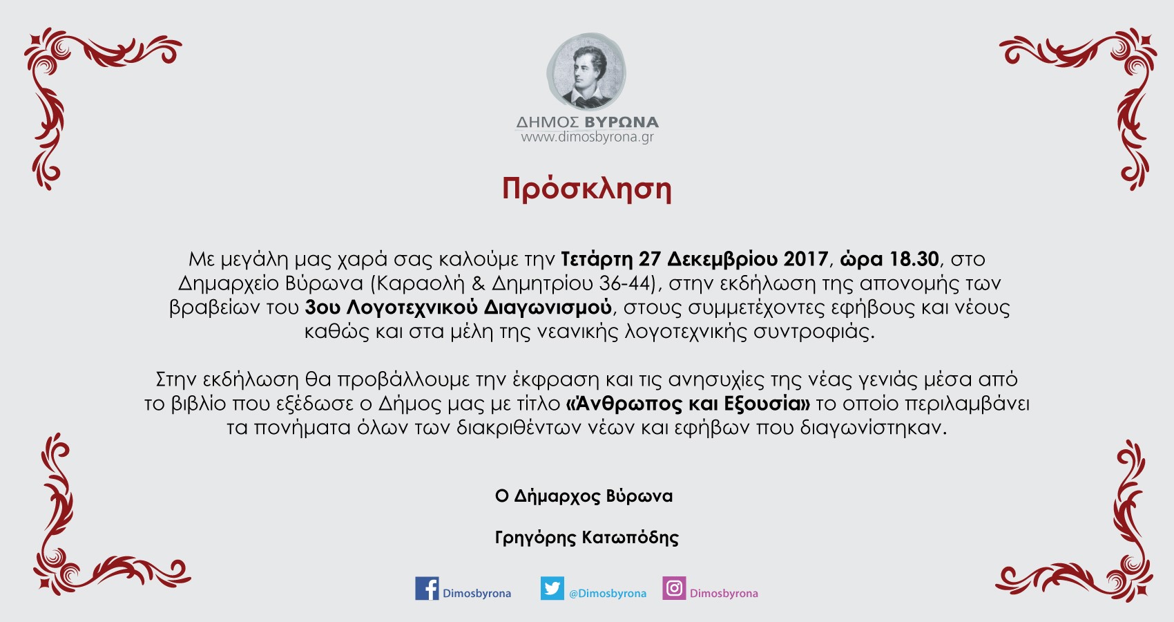 Ο Δήμος Βύρωνα βραβεύει τα νιάτα του Λογοτεχνικού Διαγωνισμού