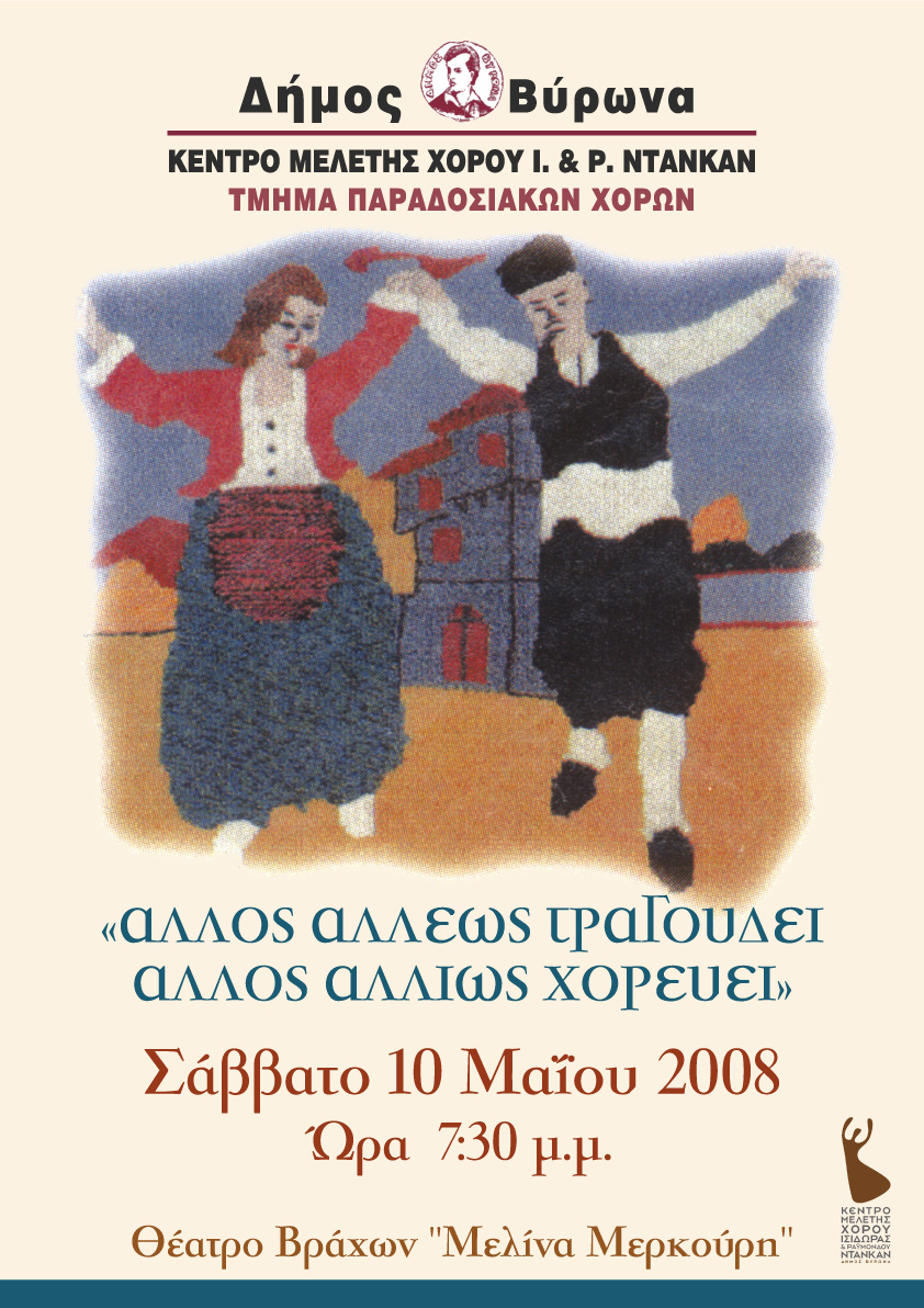 Ο Δήμαρχος Βύρωνα, Νίκος Χαρδαλιάς και η πρόεδρος του Κέντρου Μελέτης Χορού Ισιδώρας και Ραϋμόνδου Ντάκνκαν, Ρένα Παπαγεωργίου, σας προσκαλούν στην παράσταση του τμήματος Παραδοσιακών Χορών, το Σάββατο 10 Μαϊου 2008, στις 19:30, στο Θέατρο Βράχων "Μελίνα Μερκούρη".
