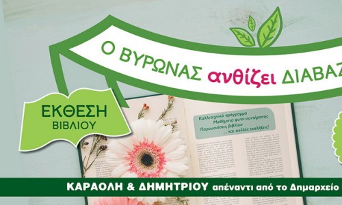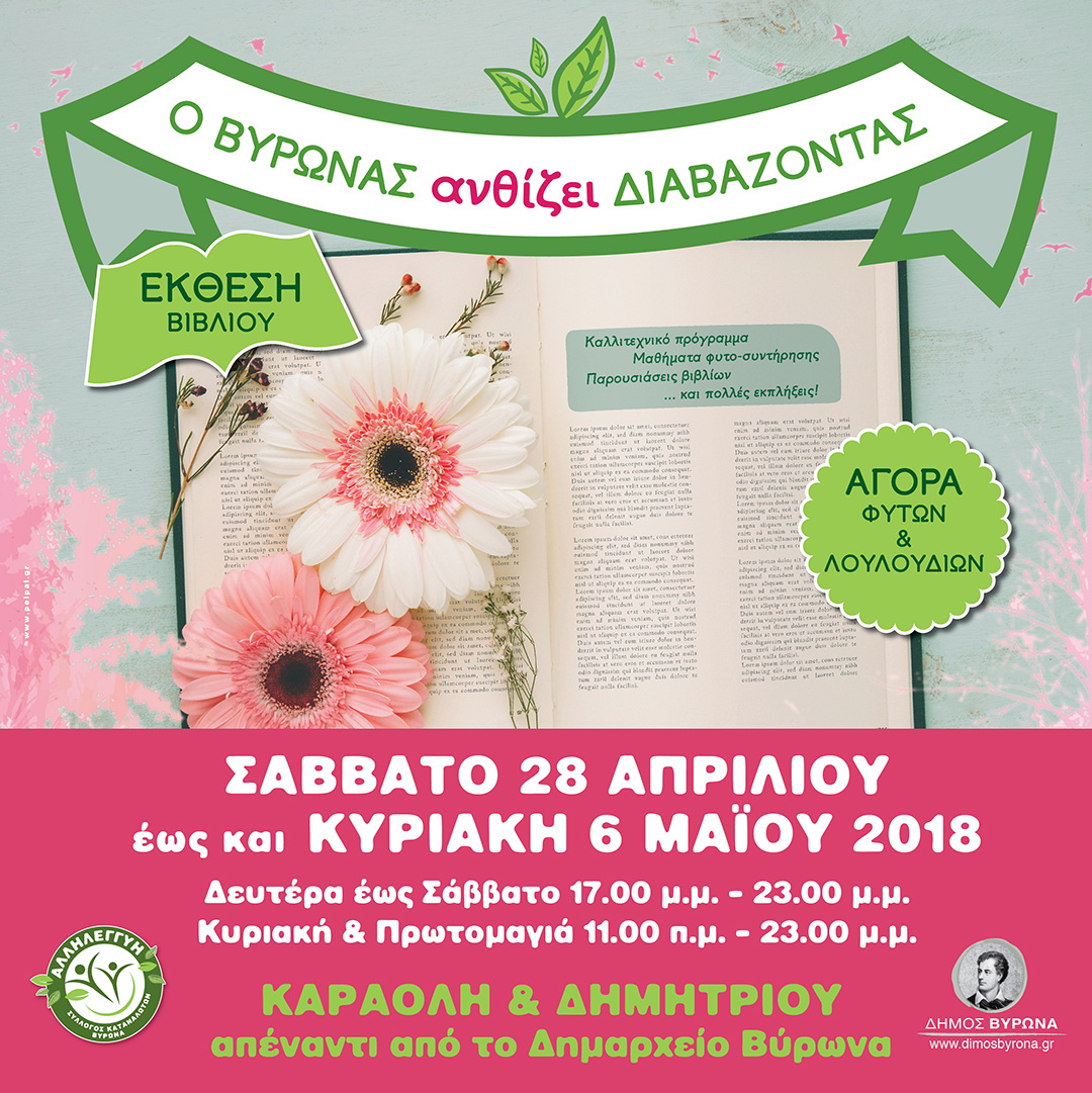 «Ο Βύρωνας ανθίζει Διαβάζοντας», ονομάζεται η έκθεση βιβλίων και φυτών που διοργανώνει ο Δήμος Βύρωνα και ο Σύλλογος Καταναλωτών «Η Αλληλεγγύη», στο πάρκο της Καραολή & Δημητρίου απέναντι από το Δημαρχείο Βύρωνα.