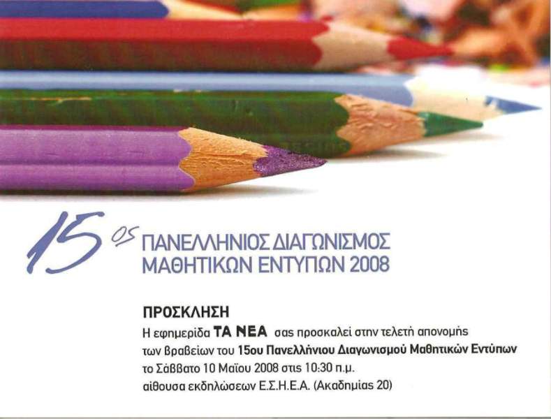 Μελλοντικοί δημοσιογράφοι θα συναντηθούν το Σάββατο 10 Μαίου, στις 10:30 το πρωί, στην αίθουσα εκδηλώσεων της Ένωσης Συντακτών, Ε.Σ.Η.Ε.Α, όπου θα διεξαχθεί ο 15ος Πανελλήνιος διαγωνισμός μαθητικών εντύπων, υπό την αιγίδα της εφημερίδας "ΤΑ ΝΕΑ".