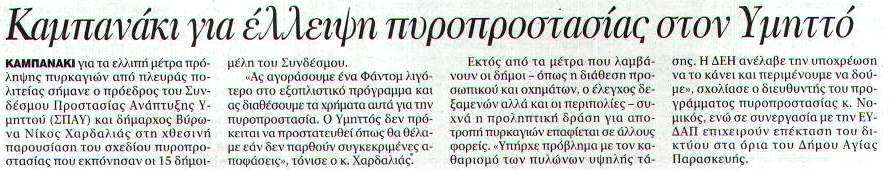 Tην Τετάρτη 7 Μαΐου, στις εγκαταστάσεις του ΕΚΕΦΕ «Δημόκριτος», πραγματοποιήθηκε η ετήσια ημερίδα παρουσίασης του Σχεδίου Αντιπυρικής Προστασίας για το καλοκαίρι του 2008 από το Σύνδεσμο Προστασίας και Ανάπτυξης Υμηττού (ΣΠΑΥ), όπου πρόεδρός του είναι ο Δήμαρχος Βύρωνα, Νίκος Χαρδαλιάς.