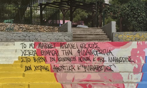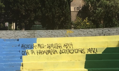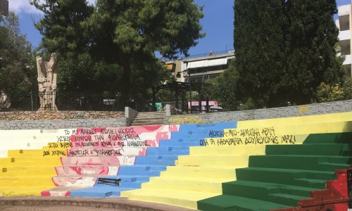 Παρόλα αυτά, μέσα σε μια εβδομάδα η πλατεία «βανδαλίσθηκε» από διάφορα συνθήματα.