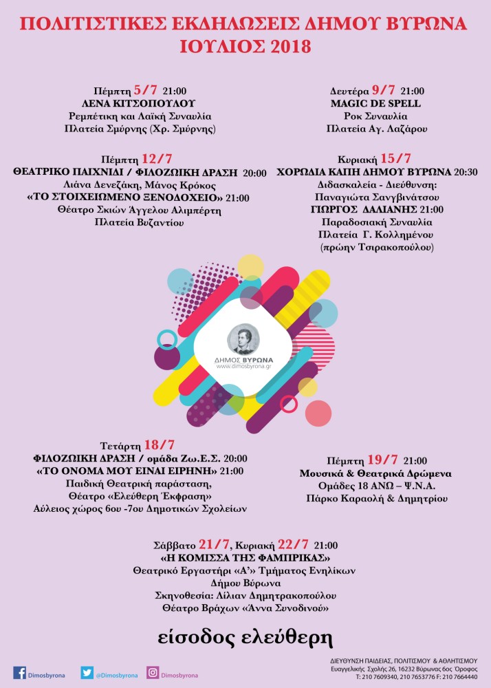 Πολιτιστικές Εκδηλώσεις Δήμου Βύρωνα Ιουλίου 2018