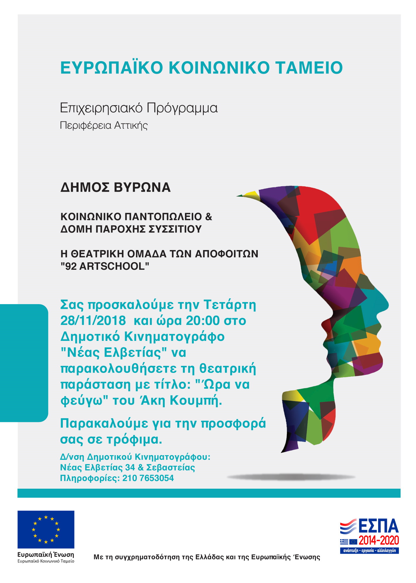 Στο πλαίσιο της κοινωνικής πολιτικής, οι Δομές “Κοινωνικό Παντοπωλείο & Παροχή Συσσιτίου” σε συνεργασία με τη θεατρική ομάδα “92artschool” σας προσκαλούν στην παράσταση “Ώρα να φεύγω”.