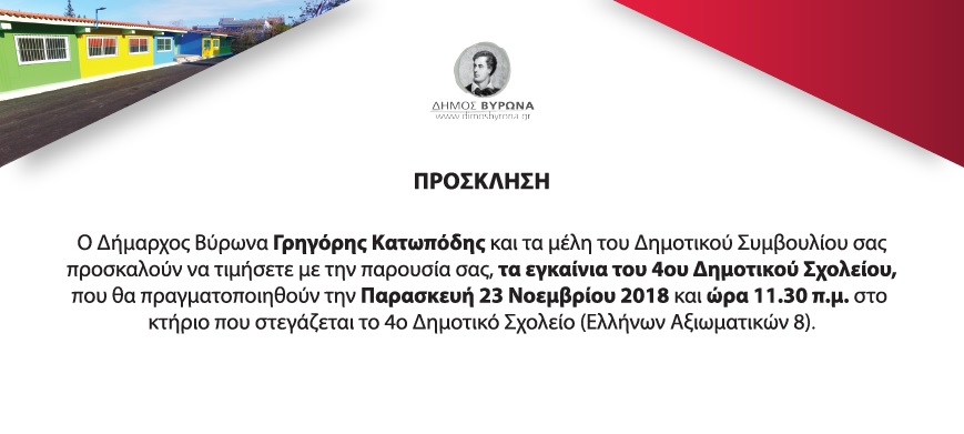 Ο Δήμαρχος Βύρωνα Γρηγόρης Κατωπόδης και τα μέλη του Δημοτικού Συμβουλίου, σας προσκαλούν να τιμήσετε με την παρουσία σας τα εγκαίνια του 4ου Δημοτικού Σχολείου, που θα πραγματοποιηθούν την Παρασκευή 23 Νοεμβρίου 2018 και ώρα 11:30 στο κτήριο που στεγάζεται επί της οδού Ελλήνων Αξιωματικών 8. Για όσους γονείς επιθυμούν να παρευρεθούν και δεν υπάρχει δυνατότητα μετακίνησης, σας ενημερώνουμε ότι, θα διατεθεί λεωφορείο της Δημοτικής Συγκοινωνίας χωρητικότητας είκοσι (20) ατόμων, που θα αναχωρήσει από την πλατεία Εθνικής Αντίστασης (Ταπητουργείο) στις 11:00 με επιστροφή στις 12:45.