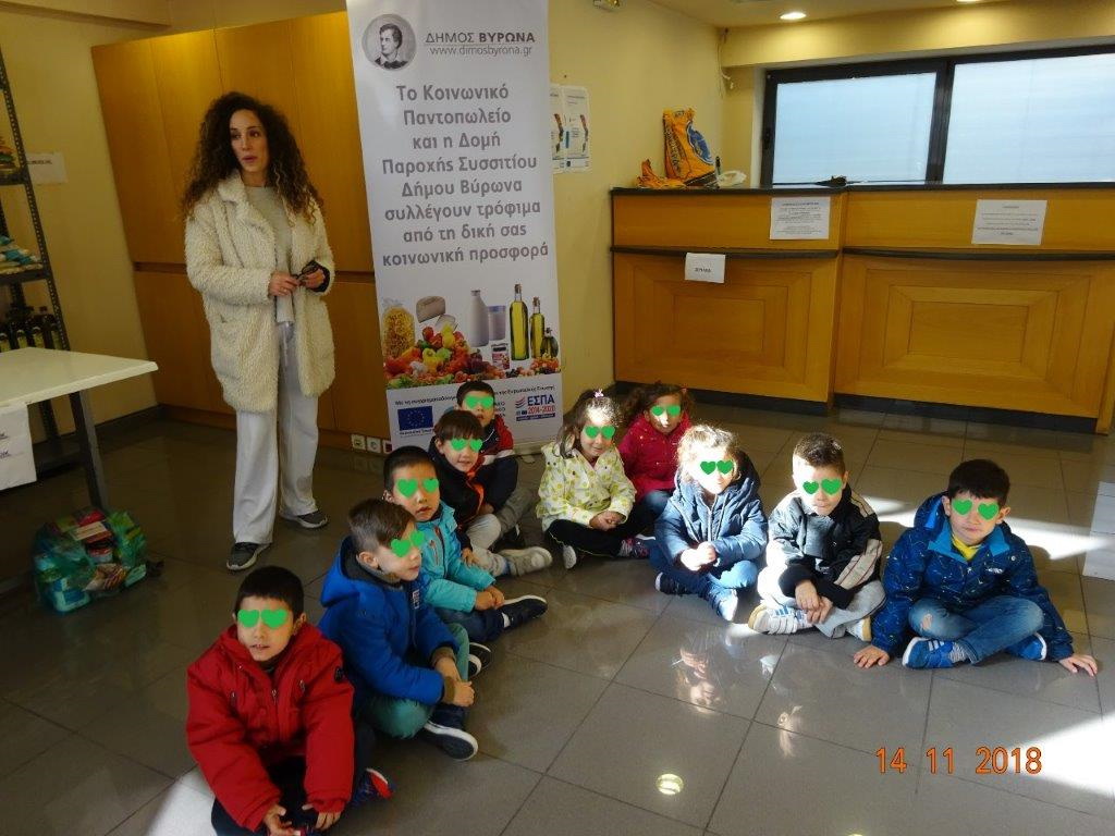 Την Τετάρτη 14 Νοεμβρίου 2018, ο Ιδιωτικός Βρεφονηπιακός Σταθμός το “Πρώτο Σκαλί” του Βύρωνα με τους εκπαιδευτικούς του Σταθμού και τους μαθητές, επισκέφτηκαν το χώρο του Κοινωνικού Παντοπωλείου & Συσσιτίου (Ιθώμης 6), με σκοπό να ενημερωθούν για το έργο που επιτελείται και να προσφέρουν τα τρόφιμα που συγκεντρώθηκαν από τους γονείς των παιδιών.