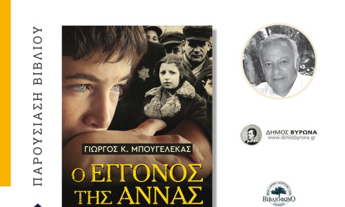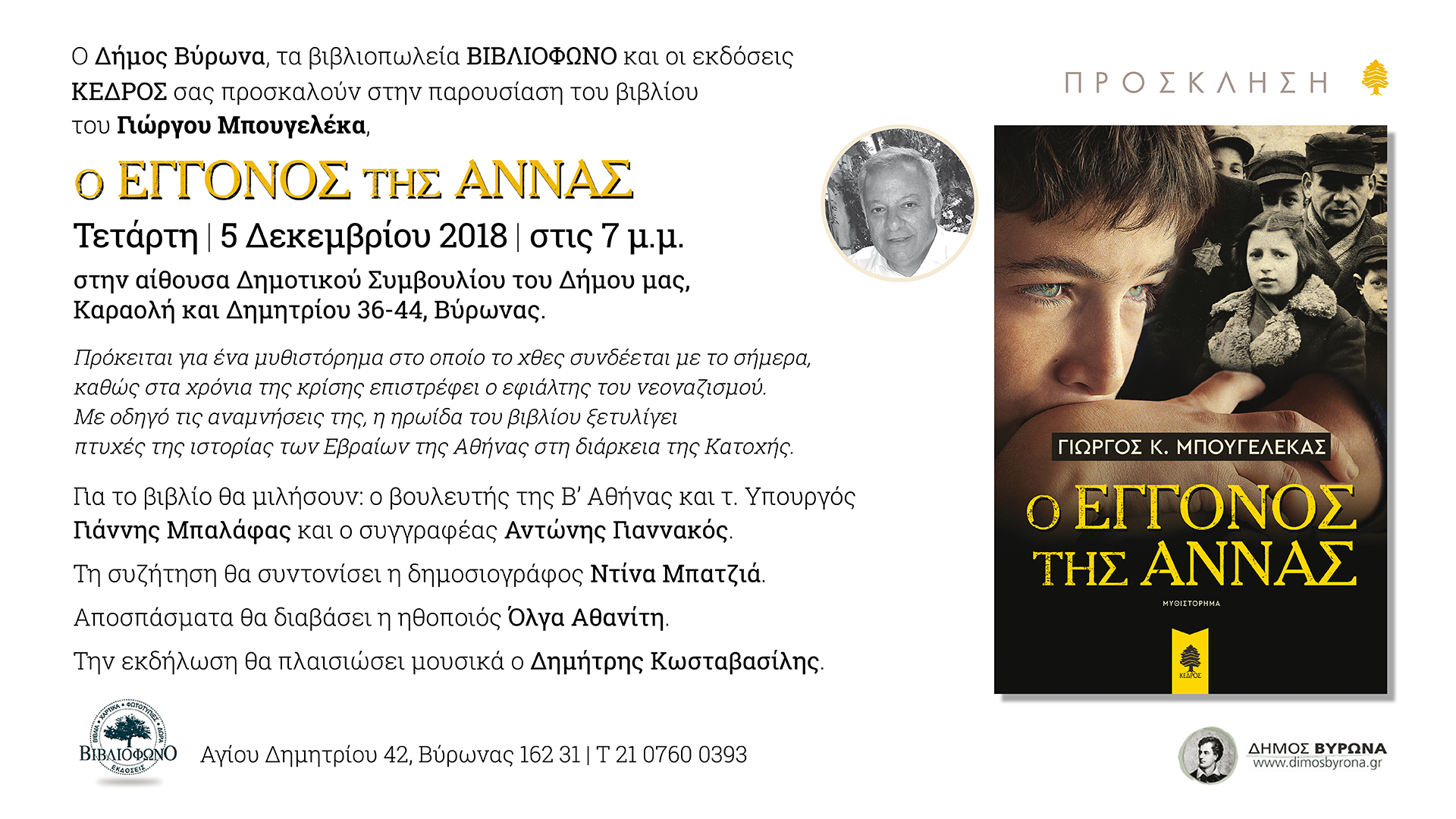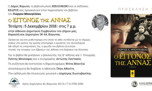 Ο Δήμος Βύρωνα, τα βιβλιοπωλεία ΒΙΒΛΙΟΦΩΝΟ και οι εκδόσεις ΚΕΔΡΟΣ, σας προσκαλούν στην παρουσίαση του βιβλίου του Γιώργου Μπουγελέκα «Ο ΕΓΓΟΝΟΣ ΤΗΣ ΑΝΝΑΣ», την Τετάρτη 5 Δεκεμβρίου 2018 στις 7.00 μ.μ. στην αίθουσα Δημοτικού Συμβουλίου του Δήμου μας,