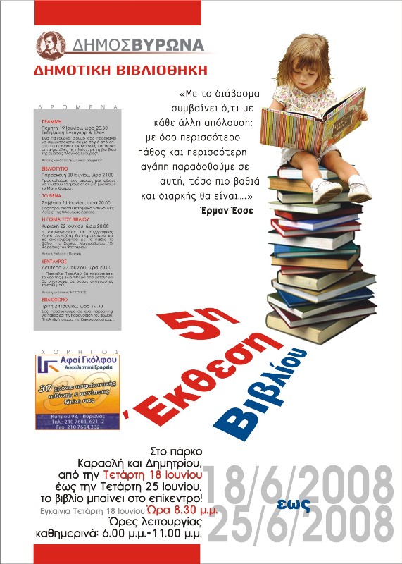 Για 5η συνεχή χρονιά, το ραντεβού μας είναι την Τετάρτη 18 Ιουνίου, στις 20:30 το απόγευμα στο πάρκο της Καρολή & Δημητρίου, όπου η Δημοτική Βιβλιοθήκη του Δήμου Βύρωνα σε συνεργασία με τους ιδιοκτήτες βιβλιοπωλείων του Δήμου, διοργανώνουν την ετήσια έκθεση Βιβλίου, η οποία θα διαρκέσει έως τις 25 Ιουνίου. Τα εγκαίνια θα γίνουν από το Δήμαρχο Βύρωνα, Νίκο Χαρδαλιά και την πρόεδρο της Δημοτικής Βιβλιοθήκης Μαρία Κοκκίνου. Παράλληλα, θα υπάρχουν ενδιαφέροντα δρώμενα για μικρούς και μεγάλους.