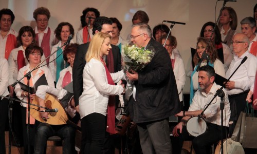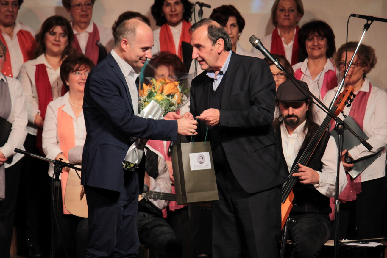 Λίγο πριν την κατακλείδα της βραδιάς, η Σχολή “Εν Ωδαίς” τίμησε τον Μουσικολογιώτατο Πρωτοψάλτη του Καθεδρικού ναού Αγίας Τριάδος Βύρωνα κ. Κωνσταντίνο Ζούμπο για τη πολυετή προσφορά του στον τομέα της εκκλησιαστικής μουσικής.