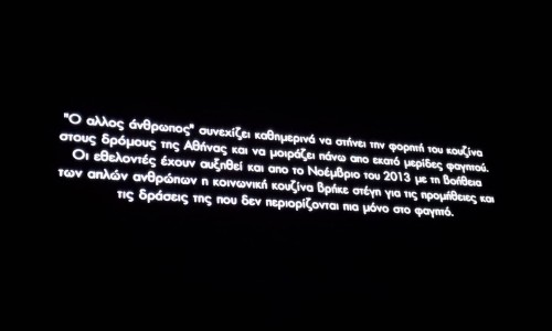 Χαιρετισμό απηύθυνε ο Κωνσταντίνος Πολυχρονόπουλος, εμπνευστής τηςκοινωνικής κουζίνας «ο ‘Αλλος ¶νθρωπος» με ένα πολύ ανθρώπινο και δυνατό μήνυμα για την αλληλεγγύη και την κοινωνική προσφορά στον συνάνθρωπο, ορμώμενος από τις προσωπικές του εμπειρίες. Οι παρευρισκόμενοι είχαν την δυνατότητα να συζητήσουν μαζί του για το έργο που επιτελείτε καθώς και να ενημερωθούν από το προσωπικό των δομών γύρω από κοινωνικά ζητήματα και δυστυχώς επίκαιρα, όπως των αστέγων, που έχουν ως συνέπεια την αναγκαιότητα υποστήριξης αυτών των δομών και προγραμμάτων.