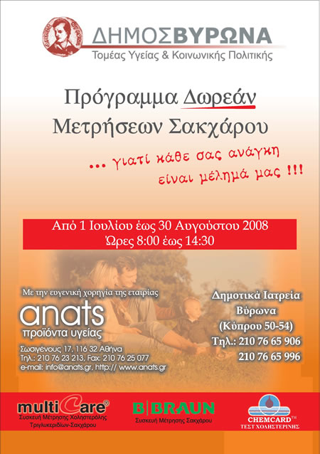 Από την 1η Ιουλίου έως και τις 30 Αυγούστου, από τις 8:00 το πρωί έως και τις 14:30 μετά το μεσημέρι, γίνεται δωρεάν μέτρηση σακχάρου στα Δημοτικά Ιατρεία του Δήμου Βύρωνα.