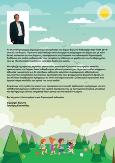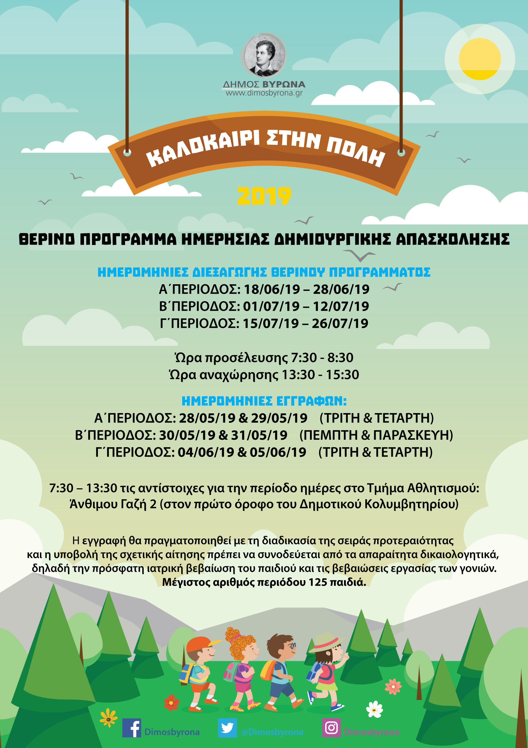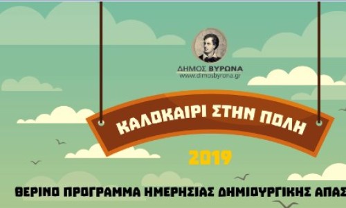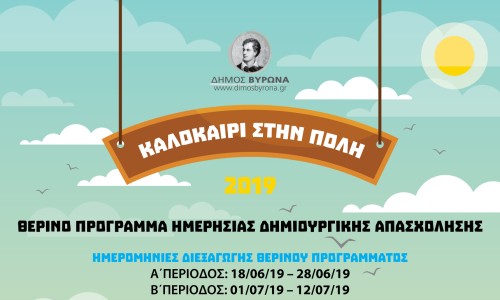 Για μία ακόμη χρονιά πραγματοποιείται το Θερινό Πρόγραμμα Δημιουργικής Απασχόλησης του Δήμου Βύρωνα. Με τη λήξη της σχολικής περιόδου εκατοντάδες παιδιά θα φιλοξενηθούν στις εγκαταστάσεις του Δήμου, με τους υπεύθυνους να καλύπτουν παιδαγωγικές, αθλητικές και καλλιτεχνικές αναζητήσεις των παιδιών, προσφέροντάς τους ψυχαγωγία και βιωματική δράση, σε ένα πλούσια διαρθρωμένο πρόγραμμα το οποίο στελεχώνεται από εξειδικευμένο προσωπικό που έμπρακτα έχει αποδείξει την αγάπη του για τα παιδιά.
