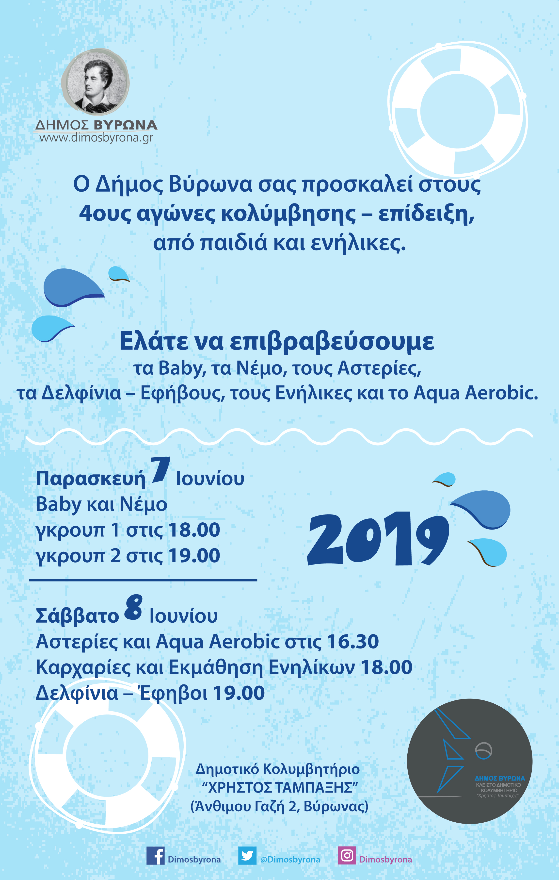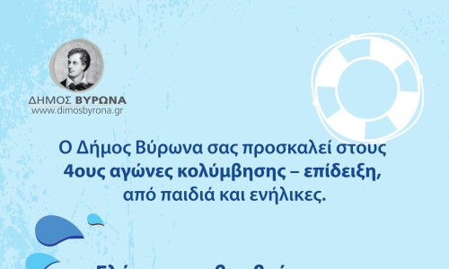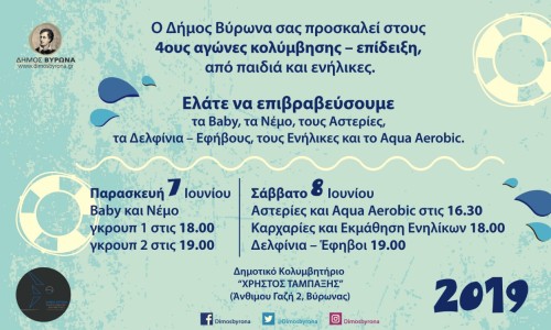Ο Δήμος Βύρωνα σας προσκαλεί στους 4ους αγώνες κολύμβησης – επίδειξης από παιδιά και ενήλικες, που θα πραγματοποιηθούν το διήμερο 7 και 8 Ιουνίου, στο Δημοτικό Κολυμβητήριο «Χρήστος Ταμπαξής» (¶νθιμου Γαζή 2, Βύρωνας).