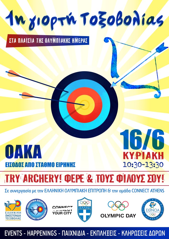 Η Ελληνική Ομοσπονδία Τοξοβολίας μέσω της Κεντρικής Επιτροπής Ανάπτυξης Τοξοβολίας (ΚΕΑΤ) και σε συνεργασία με την Ελληνική Ολυμπιακή Επιτροπή, διοργανώνει στο πλαίσιο του εορτασμού της Ολυμπιακής Ημέρας την «1η Γιορτή Τοξοβολίας» στο ΟΑΚΑ, την Κυριακή 16 Ιουνίου 2019 από 11:30 έως 14:30.