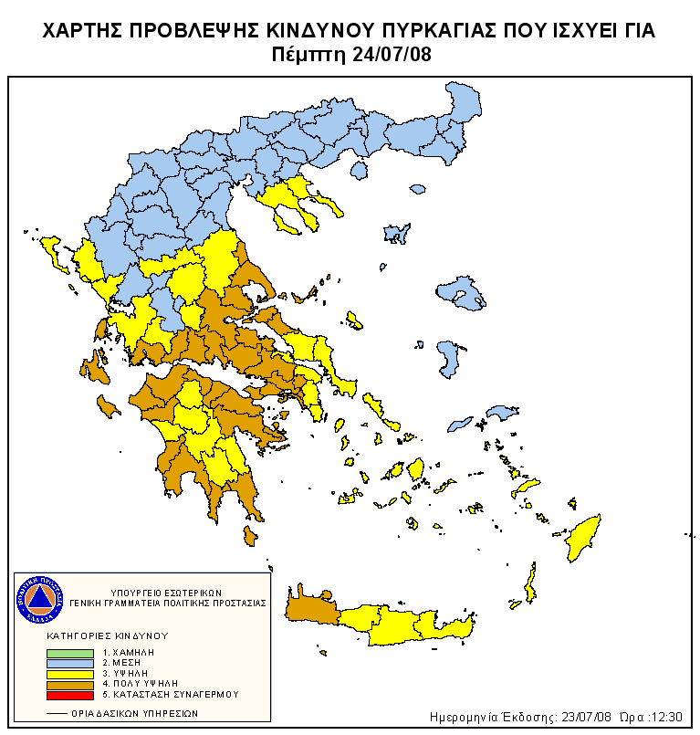 Σύμφωνα με το Χάρτη Πρόβλεψης Κινδύνου Πυρκαγιάς που εκδίδεται από τη Γενική Γραμματεία Πολιτικής Προστασίας προβλέπεται για αύριο Πέμπτη 24-07-2008 πολύ υψηλός κίνδυνος πυρκαγιάς (κατηγορία κινδύνου 4), για τις περιοχές: Αθηνών, Δυτικής Αττικής, Πειραιώς, Λάρισας, Μαγνησίας, Φθιώτιδας, Ευβοίας, Βοιωτίας, Κορίνθου, Αργολίδας, Λακωνίας, Μεσσηνίας, Ηλείας, Αχαΐας, Φωκίδας, Αιτωλοακαρνανίας, Χανίων και των νήσων Ζακύνθου, Κεφαλληνίας, Λευκάδας.