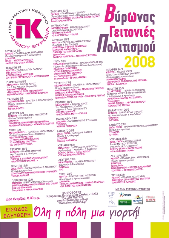 Οι εκδηλώσεις έχουν κυρίως ψυχαγωγικό χαρακτήρα και θα γίνουν σε όλες τις γειτονιές του Δήμου Βύρωνα, από την 1/9/08 έως και τις 30/9/08 με έναρξη στις 20.00.