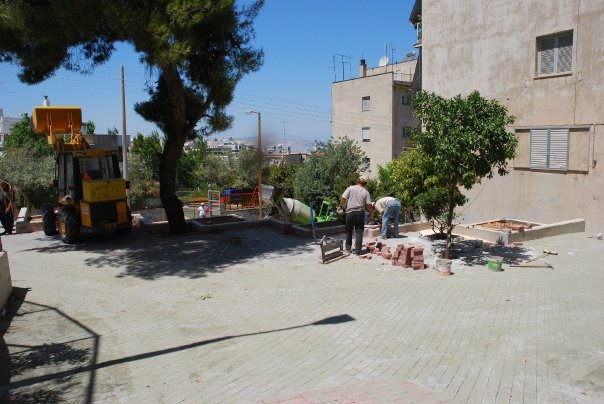Στην Πλατεία που βρίσκεται μπροστά στον Ιερό Ναό του Αγίου Γεωργίου τοποθετήθηκαν καθιστικά, σιντριβάνι, γίνεται παιδική χαρά και νέα πλακόστρωση και χωροθετήθηκαν σημεία πρασίνου. Επί πλέον πλακοστρώνεται η διαδρομή περιπάτου, που συνδέει την πλατεία με το χώρο στην οδό Κισσού στα Προσφυγικά, όπου και ανακατασκευάζονται και εξοπλίζονται οι παιδικές χαρές. Το πρανές, που υφίσταται λόγω κλίσης του εδάφους κατά μήκος της διαδρομής αυτής, ενισχύεται με νέα φύτευση. Όταν το έργο ολοκληρωθεί θα γίνει το νέο μας στέκι!!! Κατασκευάσθηκαν διαδρομές στίβου γύρω από το υπάρχον γήπεδο και επικαλύφθηκαν με συνθετικό τάπητα αμερικανικής προέλευσης και διεθνών προδιαγραφών. Επίσης, κατασκευάσθηκαν σκάμματα αλμάτων και βατήρες ρίψεων και ενισχύθηκε η περίφραξη του χώρου του γηπέδου.