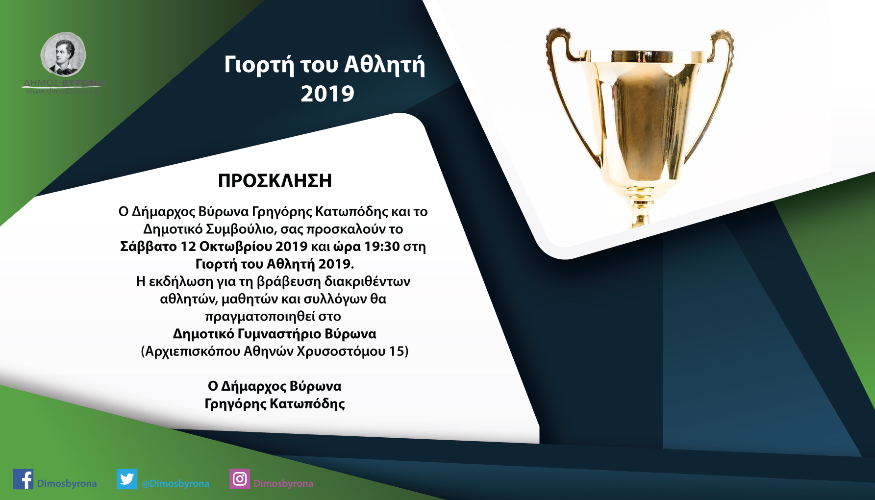 Τη «Γιορτή του Αθλητή» διοργανώνει και φέτος ο Δήμος Βύρωνα, το Σάββατο 12 Οκτωβρίου 2019 και ώρα 19:30 στο Δημοτικό Γυμναστήριο του Δήμου (Αρχιεπισκόπου Αθηνών Χρυσοστόμου 15). H εκδήλωση θα περιλαμβάνει εκτός από τις βραβεύσεις, ψυχαγωγικά προγράμματα και παρουσιάσεις των διαφόρων αθλημάτων των τοπικών σωματείων. Αναλυτικότερα: