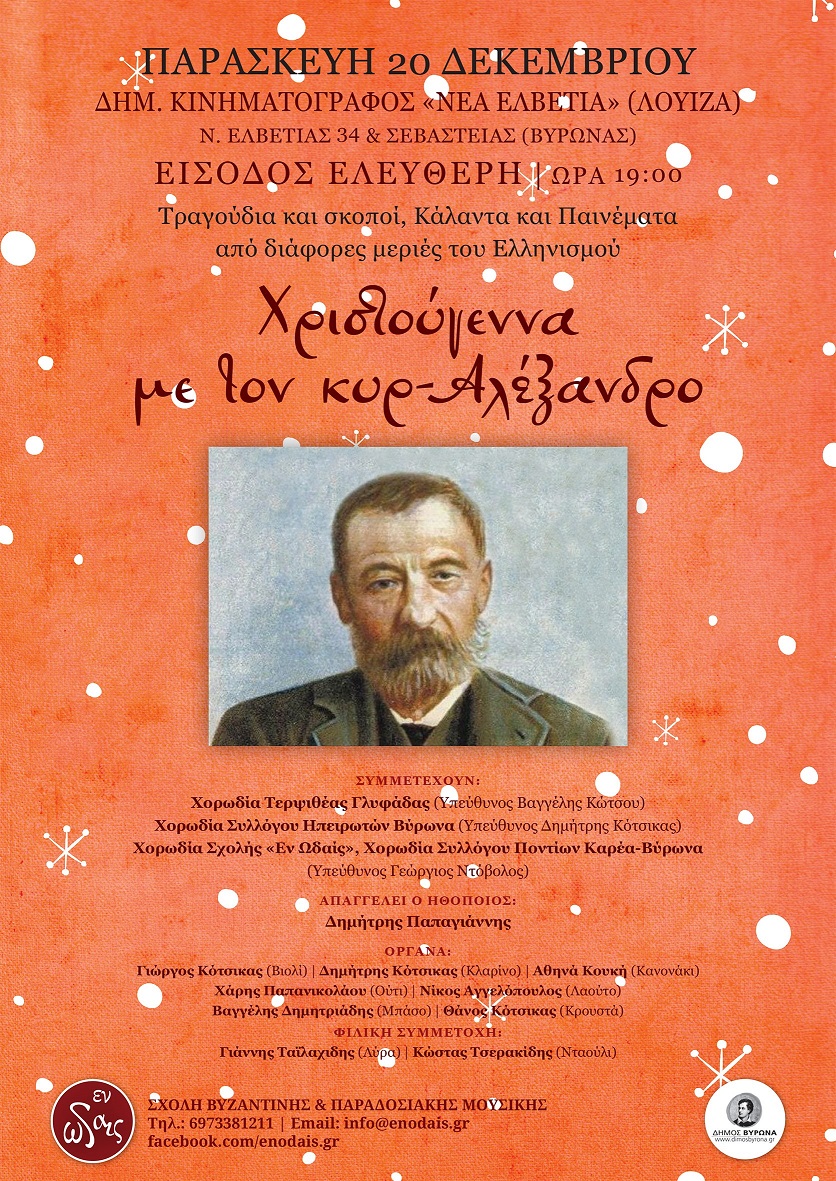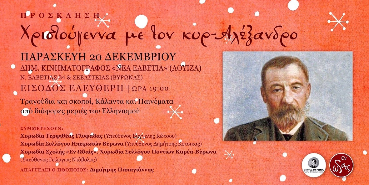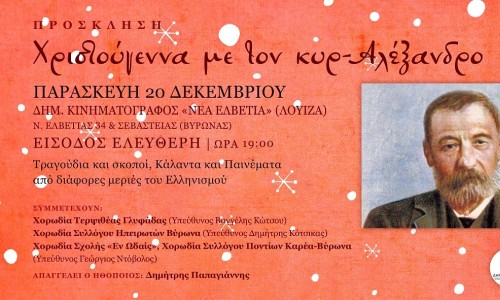Την Παρασκευή 20 Δεκεμβρίου στο Δημοτικό Κινηματογράφο "Νέα Ελβετία" στις 7:00 μ.μ., και στο πλαίσιο των χριστουγεννιάτικων εκδηλώσεων του Δήμου Βύρωνα παρουσιάζεται η εκδήλωση "Χριστούγεννα με τον κυρ-Αλέξανδρο" αφιερωμένη στο Σκιαθίτη λογοτέχνη Αλέξανδρο Παπαδιαμάντη.